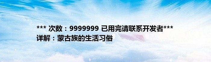 本文*** 次数:9999999 已用完请联系开发者*** 详解:蒙古族的生活习俗到此分享完毕,希望对大家有所帮助。