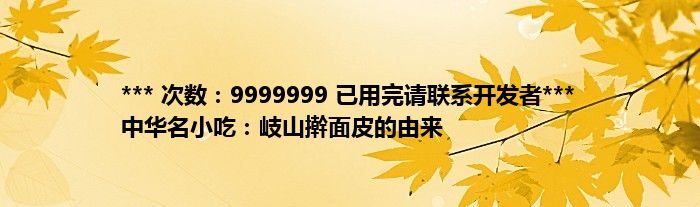 本文*** 次数:9999999 已用完请联系开发者*** 中华名小吃:岐山擀面皮的由来到此分享完毕,希望对大家有所帮助。