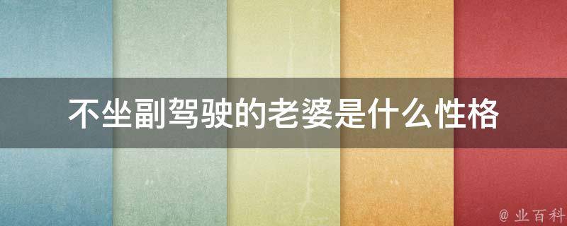 不坐副驾驶的老婆是意愿独立、自主决策的性格。这样的人可能更喜欢扮演主角,拥有更多的控制权和自由。他们可能更倾向于自己决策和规划事物,对于他们来说领导和独立是很重要的价值观。需要注意的是,拒绝坐副驾驶可能与个人的偏好、独立性、对控制权的需求或其他因素有关,而不一定反映他们的整体性格。