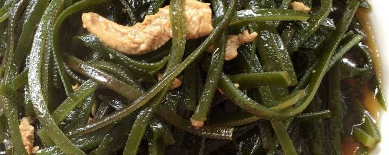 海带300克、猪肉120克、色拉油适量、料酒2勺、盐少许、姜汁1勺、白醋少许、热炒鲜露2勺、砂糖少许、生粉少许、葱1棵、鸡粉少许、姜2片、蒜瓣2个、红辣椒2个。