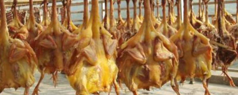 烘制:将腌好的鸡坯用麻绳分别系好,从腹部开膛的,麻绳可系在鸡腿上,从尾部开膛的,麻绳可系在鸡头上。这样做有利于鸡腔内的污水流净。然后将鸡坯挂在通风处,晾干外表的水分。最后放入55℃左右的烘房内,烘制约16~18小时,至鸡体呈金黄色时即为成品。