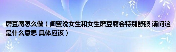 关于磨豆腐怎么做,闺蜜说女生和女生磨豆腐会特别舒服 请问这是什么意思 具体应该这个很多人还不知道,今天菲菲来为大家解答以上的问题,现在让我们一起来看看吧!