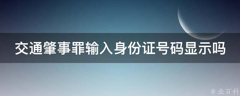 最佳答案交通肇事罪输入身份证号码显示,《刑法》第一百三十三条交通肇事罪规定,违反交通运输管理法规,因而发生重大事故,致人重伤、死亡或者使公私财产遭受重大损失的,处三年以下有期徒刑或者拘役;交通运输肇事后逃逸或者有其他特别恶劣情节的,处三年以上七年以下有期徒刑;因逃逸致人死亡的,处七年...