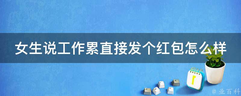 女生说工作累直接发个红包是很好的安慰方式。当女朋友抱怨工作累时,就是向别人寻求安慰,可以直接给女朋友发红包。在发红包的附言中,可以写下一些温暖的话语,表达关心和支持,例如:亲爱的,希望这个红包能带给你些许的喜悦,不开心的日子会过去的,我们一起加油。