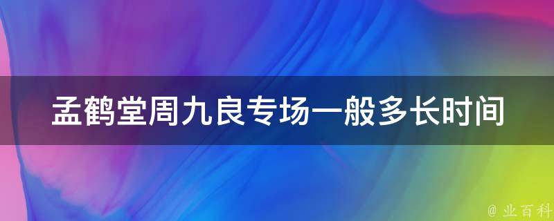 孟鹤堂周九良专场一般两个多小时。孟鹤堂周九良的专场有《搭档之争》《大保镖》《新扒马褂》《相声有新人》《能耐大了》等。孟鹤堂,本名孟祥辉,1988年4月26日出生于黑龙江省哈尔滨市阿城区,中国内地相声演员。周九良,本名周航,1994年9月14日出生于中国江苏省南京市,祖籍山东省菏泽市,中国相声演员、德云七队相声演员。