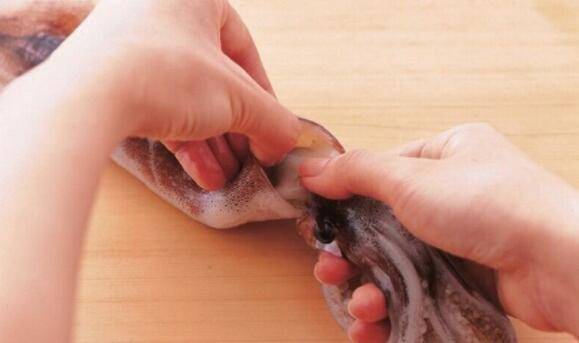 9、在乌贼足部中心有坚硬的口器,以指尖朝口器推压,然后将它拉出来。