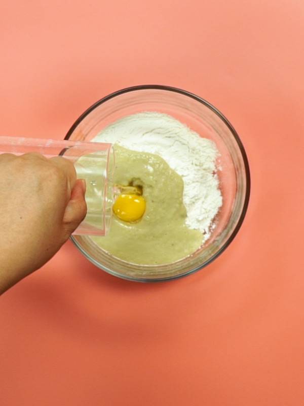 4、容器中放入低筋面粉,倒入打好的牛油果。