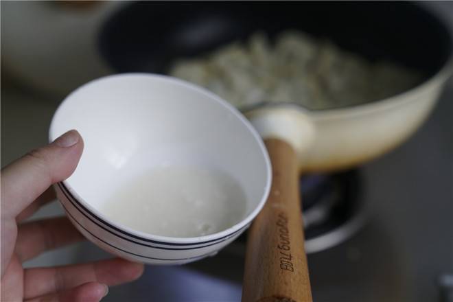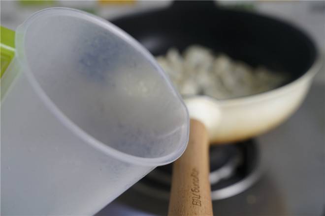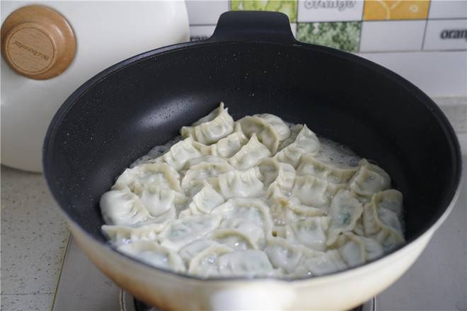 3、煎至饺子底面微微有酥脆感,再加入清水。