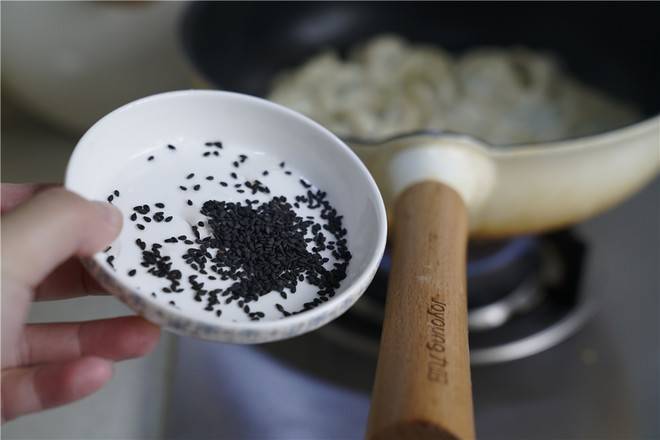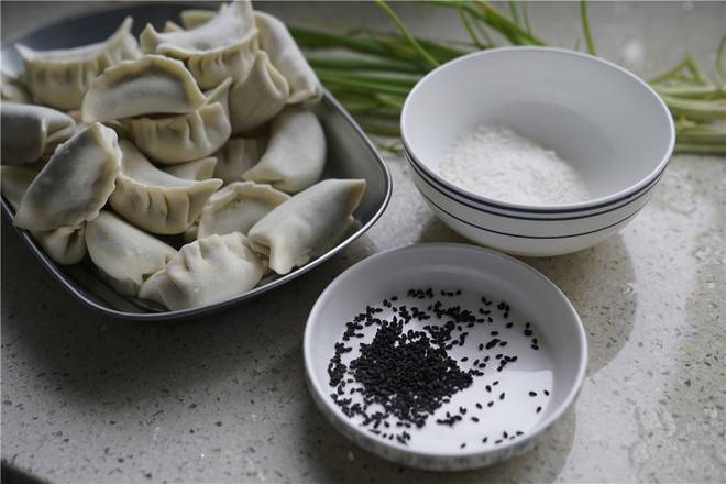 1、准备材料:速冻饺子30个、黑芝麻少许、葱适量、玉米油少许、面粉适量、清水适量。
