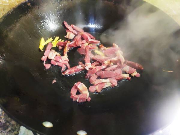 6、然后下入马肉,大火翻炒。
