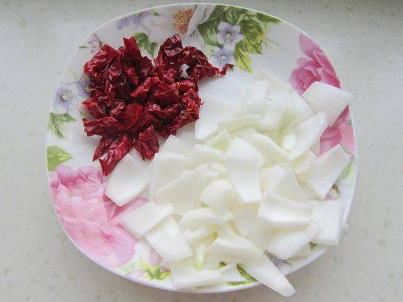 4、洋葱去外皮切片,辣皮子泡泡洗净切段。