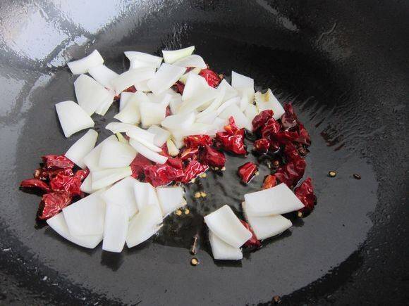 6、热锅凉油加花椒粒辣皮子小火炒出香味。