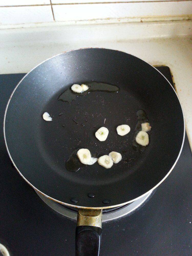 3、平底锅放油,爆香蒜片。