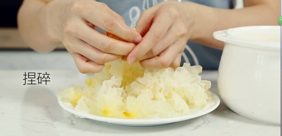 3、把浸泡好的银耳捏碎。
