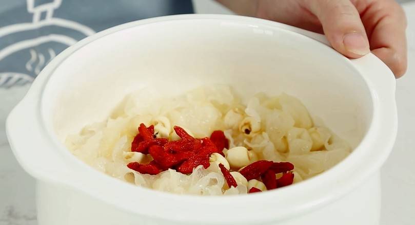 4、将捏碎的银耳、莲子、枸杞、冰糖放入炖盅,加适量清水。