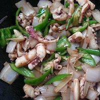 5、放入鱿鱼翻炒一下,放入洋葱、辣椒,翻炒。