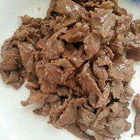 2、牛肉切丝,用料酒、盐、蚝油、生粉腌一会,鱿鱼焯水待用。