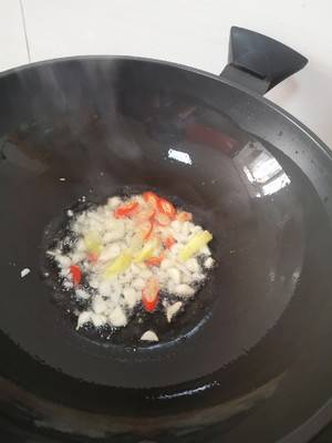 4、锅烧热加油爆香姜丝、大蒜、小米辣。