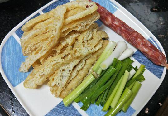 用料:芥兰一把、腊肠一条、蒜少许、面三块、油30毫升、盐2克、酱油20毫升、蚝油一勺。