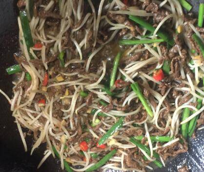 牛肉220g、绿豆芽150g、韭菜10棵、小米椒4个、生姜一小块、大蒜两头、生抽适量、老抽适量、白糖适量、生粉适量、油适量、黑胡椒适量、盐适量。