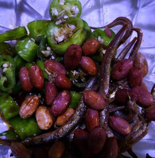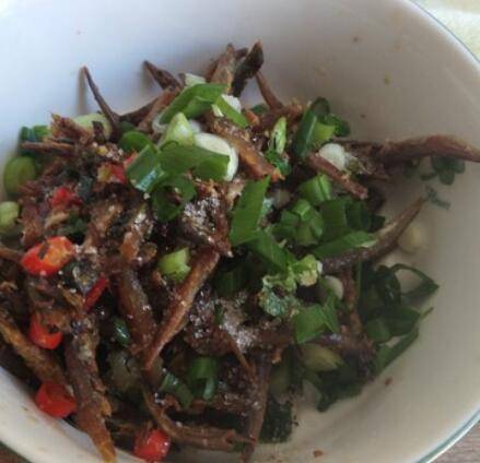 1、准备食材:小银鱼干80克、熟花生油适量、尖椒一根、盐少许、鸡精少许、酱油少许、陈醋少许。