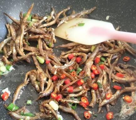 3、锅淋上油热锅,把葱花炒出香味,倒入小鱼干。
