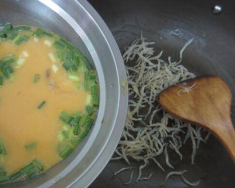5、银鱼翻炒几下后,加入3克盐调味,最后倒时蛋液,迅速翻炒至熟即可。