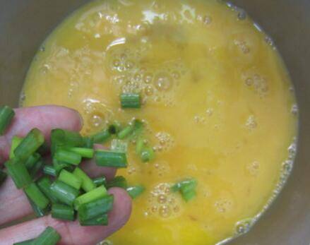 3、鸡蛋打出,加上2茶匙生抽调味,鸡蛋拌均匀后加上少许小葱。