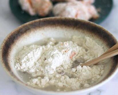 5、琵琶腿全部浸泡在放入糊里,捞起来,沥一个糊,再放入炸鸡裹粉里裹上粉。