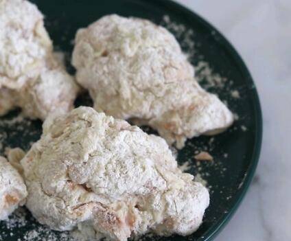 3、腌制好的琵琶腿,放入炸鸡裹粉里,第一次裹粉。