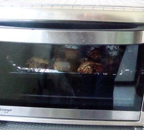 4、烤盘里面铺锡纸,把腌制好的鸡腿摆放在上面。