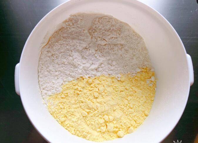 2、加入过筛后的玉米面和面粉。
