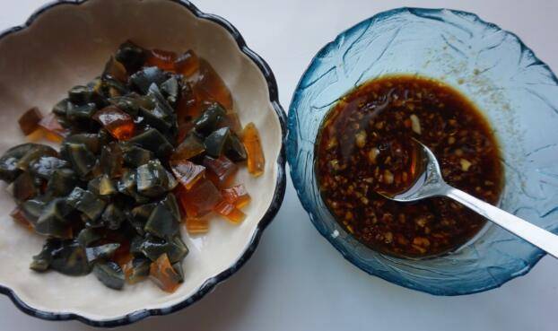 2、姜蒜末放碗里,加一勺白糖,2勺醋,一勺生抽,适量盐,几滴香油调匀。皮蛋切丁。