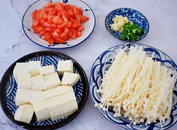 1、准备食材:番茄1个、豆腐250克、金针菇200克、蒜10克、盐、水淀粉、水800毫升、油、葱。番茄先在顶部切十字,用开水烫至皮开,撕去皮切成小块,嫩豆腐切小块,金针菇去根部洗净备用,蒜切末,葱切末。