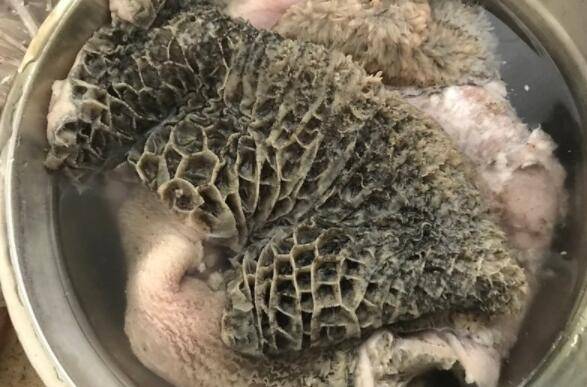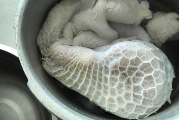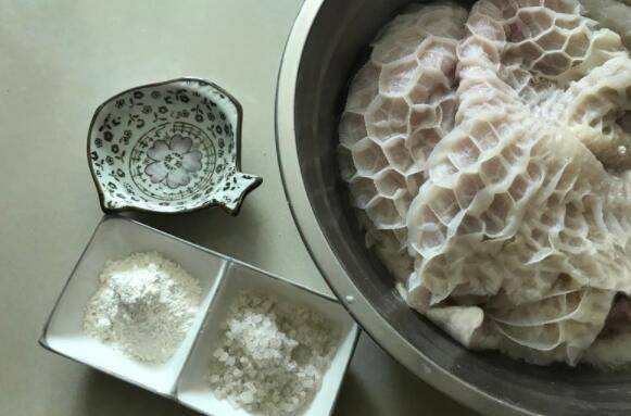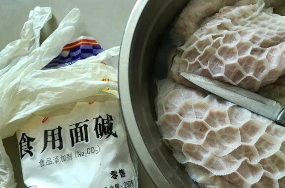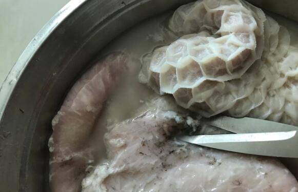 2、牛肚中放入食用碱和一点水,戴手套抓揉一会,再用小刀刮,多换方向刮干净为止。