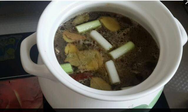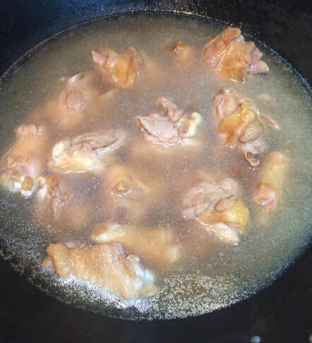 5、倒入老抽加水没过食材开大火烧煮后放人姜片和八角茴香。
