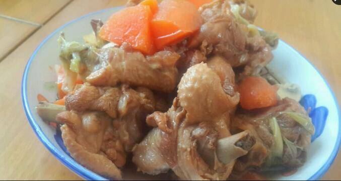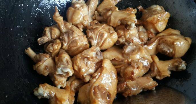 3、红萝卜切块,炒锅里放少许油,放冰糖,小火熬出糖色,放鸭翅根翻炒至均匀上去糖色。