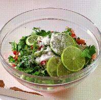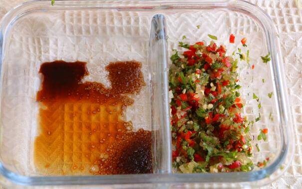 5、趁此时间调制浇汁,将白糖与鱼露混合均匀,泰椒、薄荷、大蒜切末混合均匀。