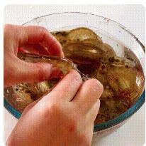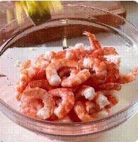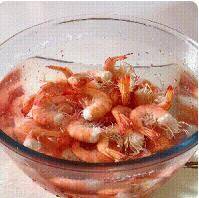 4、烫至变色后捞出,放进冷水里浸透,再把虾壳去掉放入碗中备用。