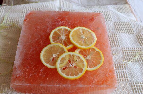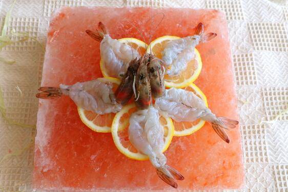 6、将腌制好的虾取出,在盐盘上摆上切好的柠檬片。