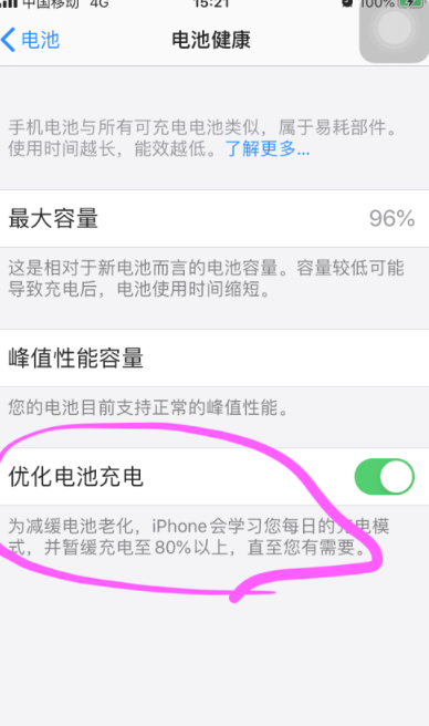 点击电池健康,电池健康里面优化电池充电功能,优化了充电模式,减缓电池老化,在需要时再次充电;