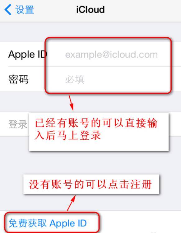 2、此时会看到icloud的设置界面有很多选项,对于已经有帐号的朋友则直接在Apple ID和密码中输入即可登录,而没有Apple ID的朋友继续往下看。选择界面最后的“免费获取Apple ID”,如图所示。