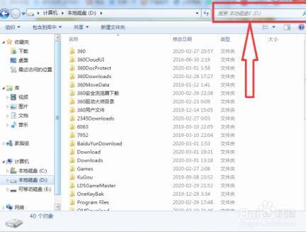 如果文件已经还原的话,可以打开计算机的磁盘(例如D盘),在页面右上角可见搜索栏。