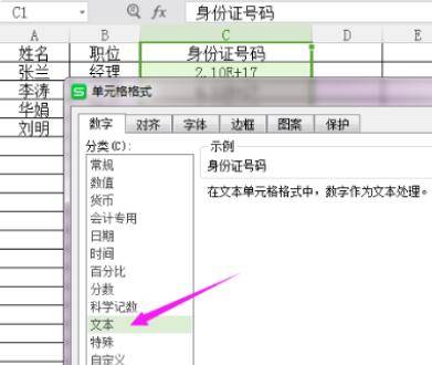 4、选择“文本”,将会使单元格里的数字作为文本处理,就可以完全显示身份证号码了。
