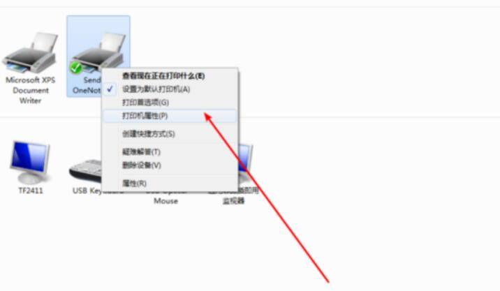 3、在进入“设备和打印机”后可以看到电脑上所有的打印机和其他设备,这时候选择电脑连接的打印机,右击,选择“打印机属性”。