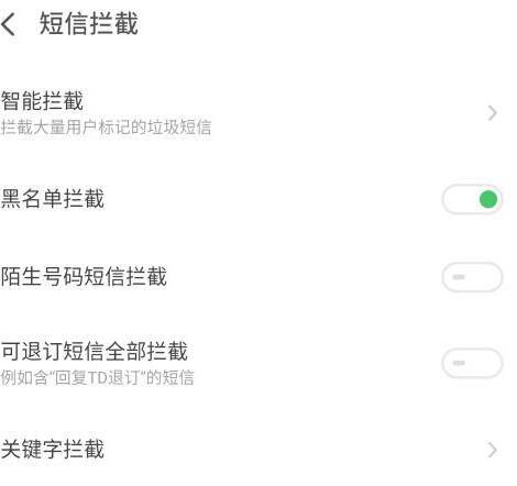 在此页面即可设置短信拦截方式,可以拦截所有陌生号码,或者只拦截黑名单号码。
