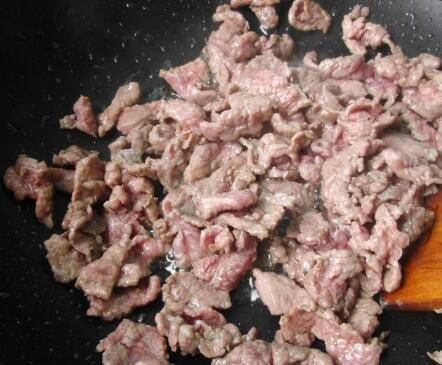 炒锅中热油,放入牛肉滑炒变色后盛出。