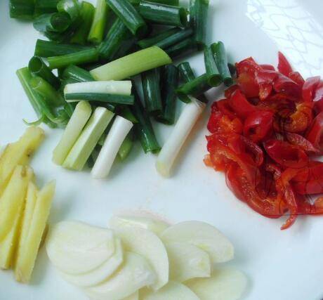 芹菜切段,葱、姜、蒜、泡椒备好。