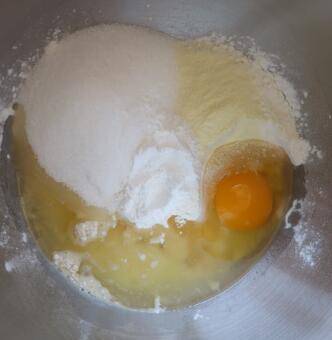 用料:中筋面粉280g、全脂奶粉20g、白糖125g、色拉油75g、鸡蛋1个、泡打粉4g、小苏打2g、牛奶40-50ml、全蛋液适量。