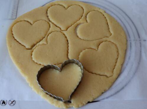 5、准备上下两张油纸,将面团放在中心,擀成1cm厚的面片,用模具压出饼干形状,多余的面团再次揉在一起,擀薄、压出花形。